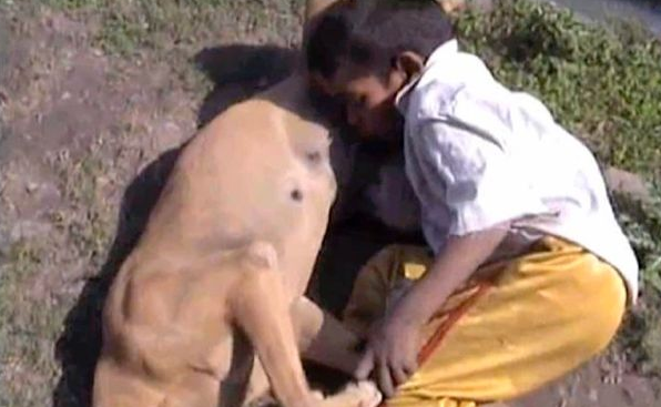 Chotu Kumar un pequeño de tan sólo seis años asegura que está tan hambriento que tiene que tomar leche de un perro al no tener nunca comida en su hogar.